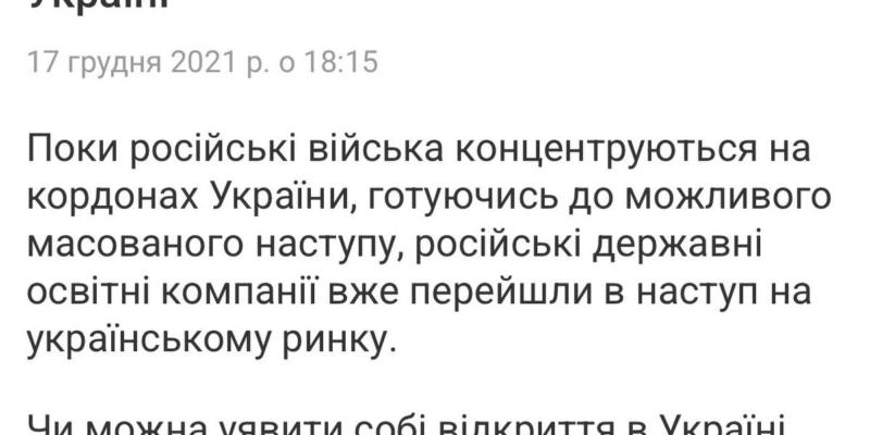 У грудні 2021-го вийшла стаття "Росіяни захоплюють ринок освіти в Україні". Напередодні повномасштабного вторгнення. Ніхто особливо не реагував.
